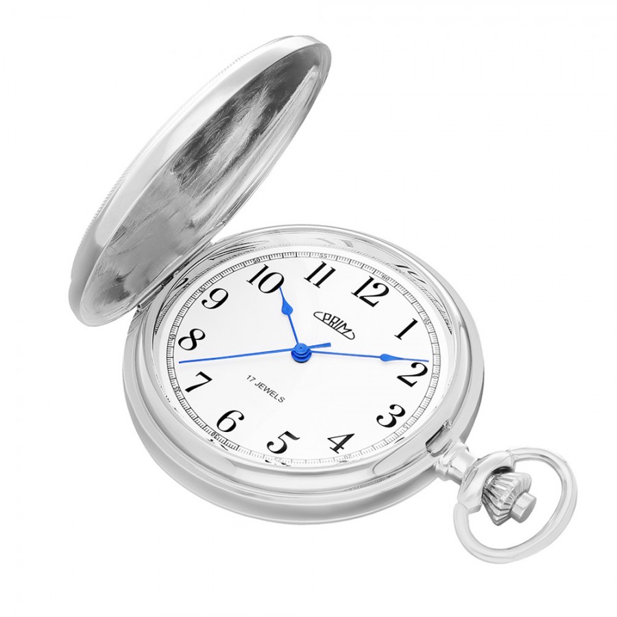 Klasické mechanické kapesní hodinky PRIM s ručním nátahem s arabskými číslicemi. Nově navržený plášť hodinek zdobí symbol českého znaku, tedy dvouocasý lev doplněný erbem, který se perfektně hodí k individualizaci monogramu. Hodinky jsou dodávány s nerezovým řetízkem.