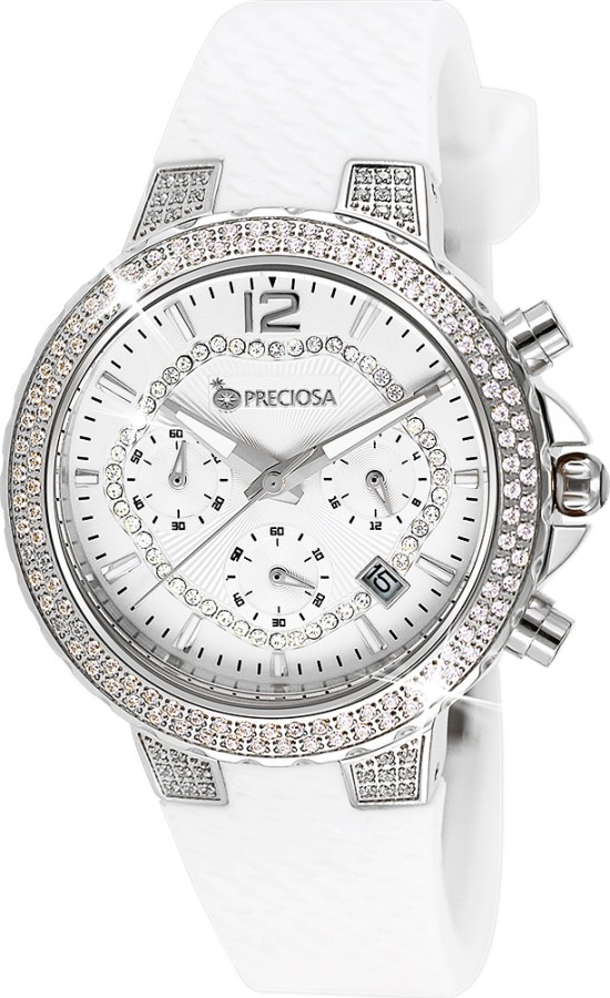 Elegantní hodinky s chronografem, duálním 24 hodinovým číselníkem a datumem. Pouzdro je vyrobeno z ušlechtilé oceli 316L upravené leštěním do vysokého lesku. Zdobení pouzdra kubickou zirkonií PRECIOSA je provedeno CNC technologií, kdy jsou krystaly fasovány do ocelového pouzdra. Netradiční vzhled dodává hodinkám silikonový řemínek. 5 ATM zaručuje odolnost proti vodě při běžném užívání. Tyto hodinky jsou dodávány v luxusní krabičce se záručním listem a návodem.