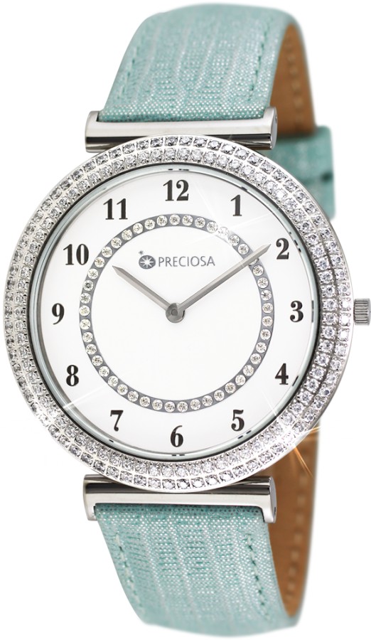 Dámské módní hodinky PRECIOSA. Pouzdro je vyrobeno z ušlechtilé oceli 316 L upravené leštěním do vysokého lesku. Zdobení pouzdra kubickou zirkonií PRECIOSA je provedeno CNC technologií, kdy jsou krystaly fasovány do ocelového pouzdra. Eleganci a šarm hodinkám dodává řemínek z kvalitní kůže. 5 ATM zaručuje odolnost proti vodě při běžném užívání. Tyto hodinky jsou dodávány v luxusní krabičce se záručním listem a návodem.