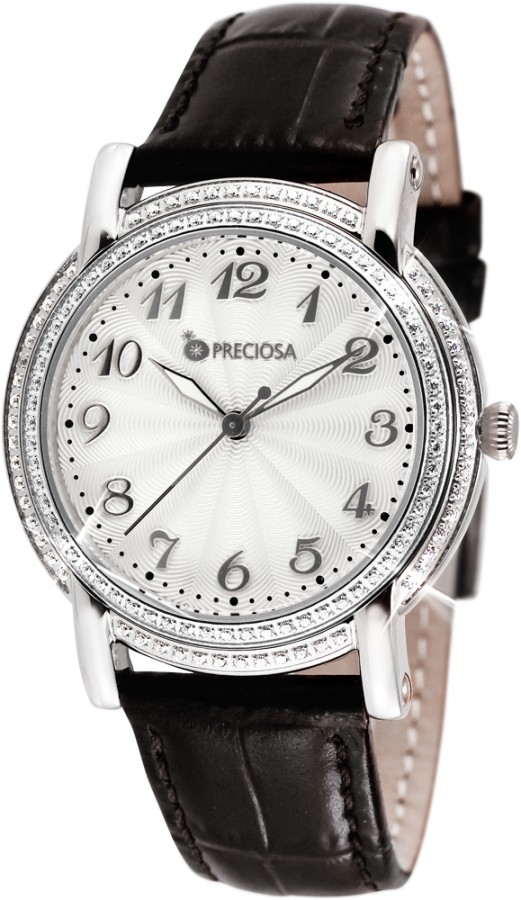 Dámské hodinky PRECIOSA. Pouzdro je vyrobeno z ušlechtilé oceli 316 L upravené leštěním do vysokého lesku. Zdobení pouzdra kubickou zirkonií PRECIOSA je provedeno CNC technologií, kdy jsou krystaly fasovány do ocelového pouzdra. Eleganci a šarm hodinkám dodává řemínek z kvalitní kůže. 5 ATM zaručuje odolnost proti vodě při běžném užívání. Tyto hodinky jsou dodávány v luxusní krabičce se záručním listem a návodem.