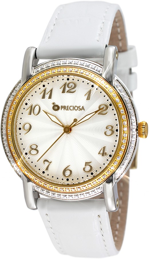 Dámské hodinky PRECIOSA. Pouzdro je vyrobeno z ušlechtilé oceli 316 L upravené leštěním do vysokého lesku. Zdobení pouzdra kubickou zirkonií PRECIOSA je provedeno CNC technologií, kdy jsou krystaly fasovány do ocelového pouzdra. Eleganci a šarm hodinkám dodává řemínek z kvalitní kůže. 5 ATM zaručuje odolnost proti vodě při běžném užívání. Tyto hodinky jsou dodávány v luxusní krabičce se záručním listem a návodem.