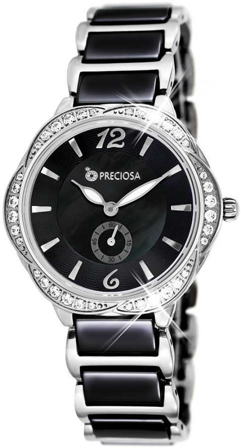 Dámské značkové hodinky PRECIOSA s vteřinovým číselníkem. Pouzdro je vyrobeno z ušlechtilé oceli 316 L upravené leštěním do vysokého lesku. Zdobení pouzdra kubickou zirkonií PRECIOSA je provedeno CNC technologií, kdy jsou krystaly fasovány do ocelového pouzdra ve tvaru květiny. Řemínek hodinek je vyroben z kombinace dvou materiálů, ušlechtilé oceli 316 L a keramiky. 5 ATM zaručuje odolnost proti vodě při běžném užívání.
