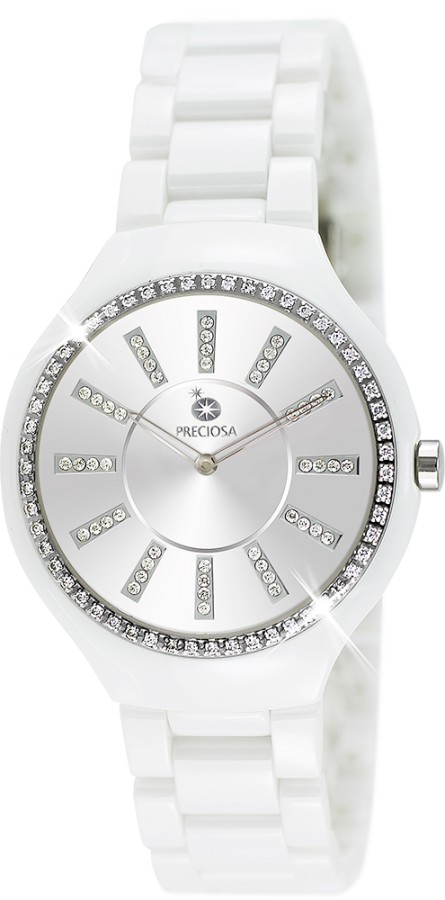 Elegantní dámské hodinky PRECIOSA. Pouzdro a tah hodinek jsou vyrobeny z keramického materiálu, který je velmi odolný proti poškrábání. Na kroužku z ušlechtilé oceli 316L jsou zafasovány krystaly PRECIOSA. Zdobení pouzdra kubickou zirkonií PRECIOSA je provedeno CNC technologií, kdy jsou krystaly fasovány do ocelového kroužku.z kombinace dvou materiálů, ušlechtilé oceli 316 L a keramiky. 5 ATM zaručuje odolnost proti vodě při běžném užívání.