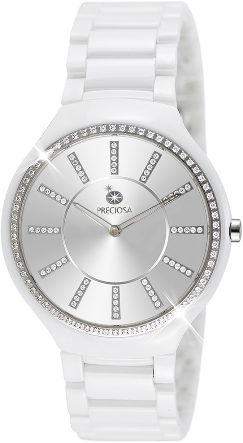 Elegantní dámské hodinky PRECIOSA. Pouzdro a tah hodinek jsou vyrobeny z keramického materiálu, který je velmi odolný proti poškrábání. Na kroužku z ušlechtilé oceli 316L jsou zafasovány krystaly PRECIOSA. Zdobení pouzdra kubickou zirkonií PRECIOSA je provedeno CNC technologií, kdy jsou krystaly fasovány do ocelového kroužku.z kombinace dvou materiálů, ušlechtilé oceli 316 L a keramiky. 5 ATM zaručuje odolnost proti vodě při běžném užívání.