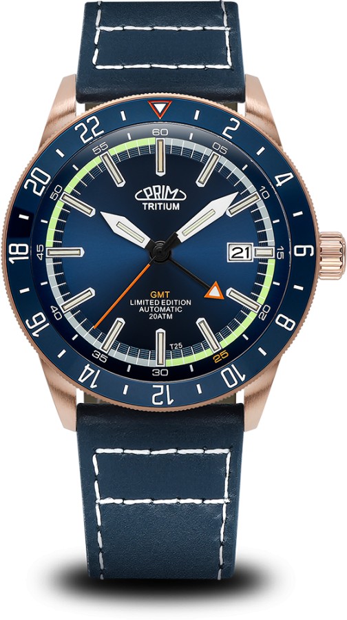 Sportovní pánské hodinky s číselníkem osazeným speciálními kapilárami plněnými tritiem (T25), vyrobenými ve Švýcarsku, jež jsou upevněny v hodinových indexech a ručičkách. V případě PRIM Sport Tritium 25 – World Timer jsou kapiláry v kombinaci oranžové na pozici 12 hodin a zelené na ostatních indexech.